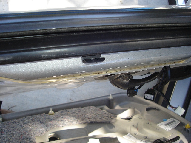 Looking down as if from the top of the window. The top edge of the panel hangs in several of these clips. After removing the 3 phillips screws, the 2 torx screws and the door handle trim I slowly unsnapped the panel from the lower left corner then continued along the bottom and up the sides. Swing it out a bit and pull up.